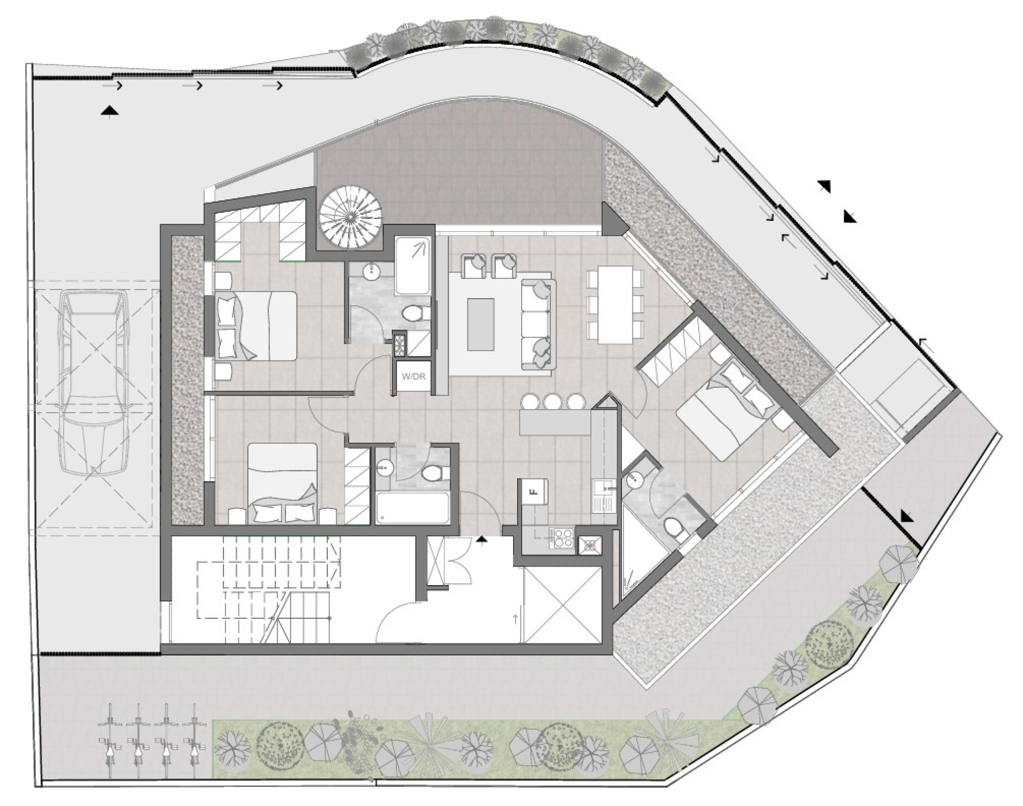 This exclusive residential development comprises a five-storey building with only four whole-floor apartments, ensuring exceptional privacy, comfort, and a boutique living experience. Positioned in front of a beautifully landscaped roundabout with mature trees and rich greenery, the project enjoys serene, open views and a peaceful ambience that is rarely found in urban environments. The building offers spacious 2- and 3-bedroom apartments, including a premium 3-bedroom penthouse with a private roof garden—perfect for those seeking refined city living with generous outdoor space. The roof garden is designed for seamless indoor-outdoor living, providing an ideal setting for family gatherings, entertaining, or quiet relaxation. It can be customized with options such as a BBQ area, kitchenette, and WC, offering both comfort and practicality. Situated in the heart of Larnaca, the development offers a rare balance of tranquility and convenience. Residents are within walking distance of schools, supermarkets, and everyday amenities, while still enjoying the atmosphere of a peaceful residential neighborhood. The famous Phinikoudes promenade and its Blue Flag beach are just a 15-minute walk away, making this an ideal choice for both permanent living and holiday escapes.
