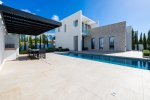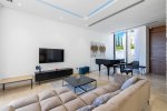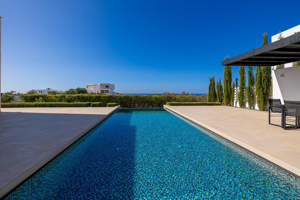Indulge in Mediterranean resort living with this must-see villa, just a 3-minute stroll from the sandy beach and one of the most luxurious seaside resorts in Cyprus with all its 5* amenities. This exquisite 3+ bedroom retreat provides a serene escape from the bustling city life while still being just a short drive away from Pafos. The spacious and sunlit living area, paired with a separate kitchen, seamlessly extends to a delightful, breezy veranda with BBQ space and a stylish pool area. The ground floor also hosts a sizable bedroom with direct access to the pool and the garden. An elevator access to the first floor takes you to another two bedrooms: one master bedroom with a spacious sea view veranda and one guest bedroom with garden views. The lower level, a versatile space, can transform into practical areas like a kids' playroom or cinema room, with additional maid's quarters and convenient access to the main level. This property, with its top-of-the-range specifications, including underfloor heating and VRV air-conditioning, offers comfort and style for a truly luxurious living experience.