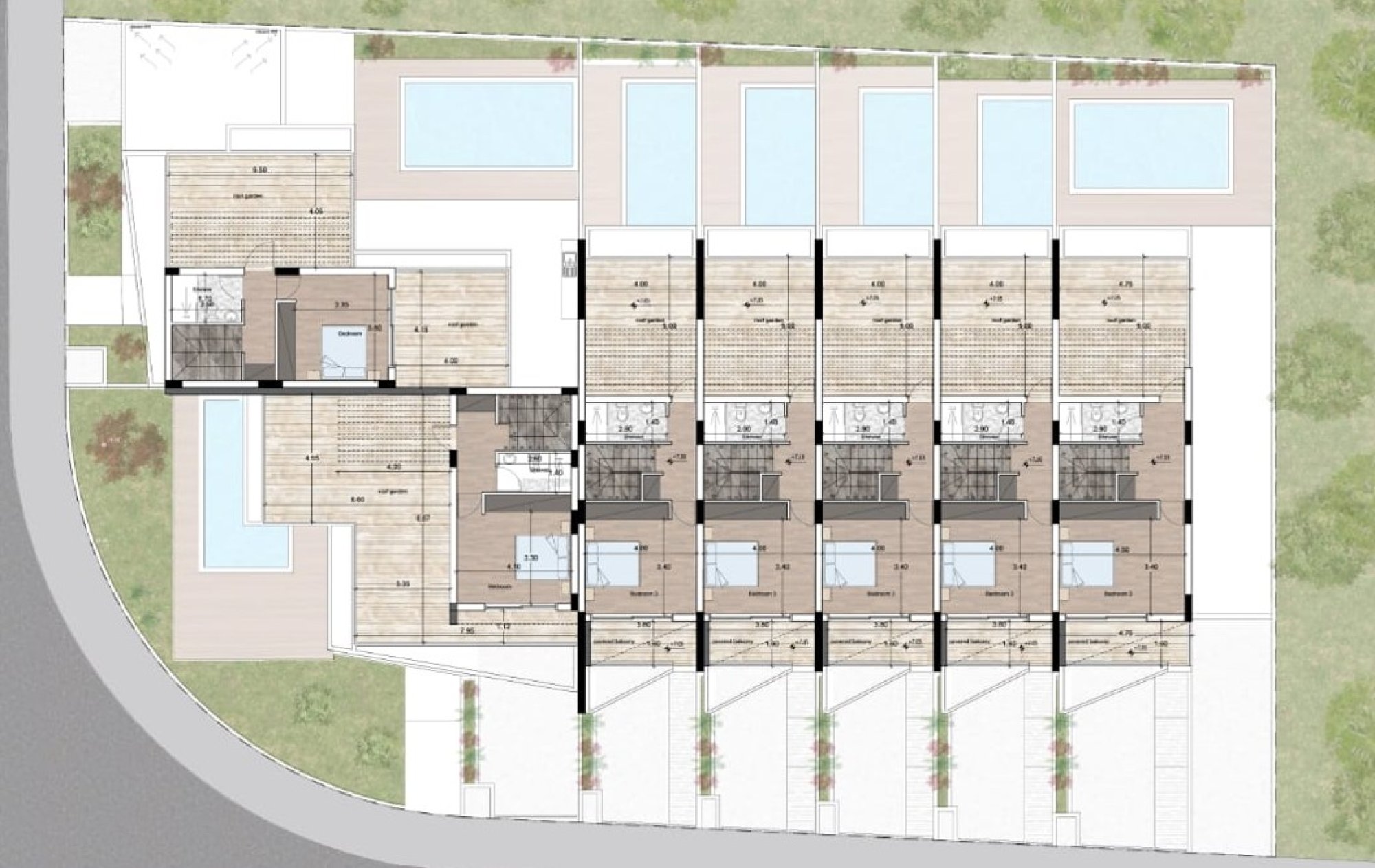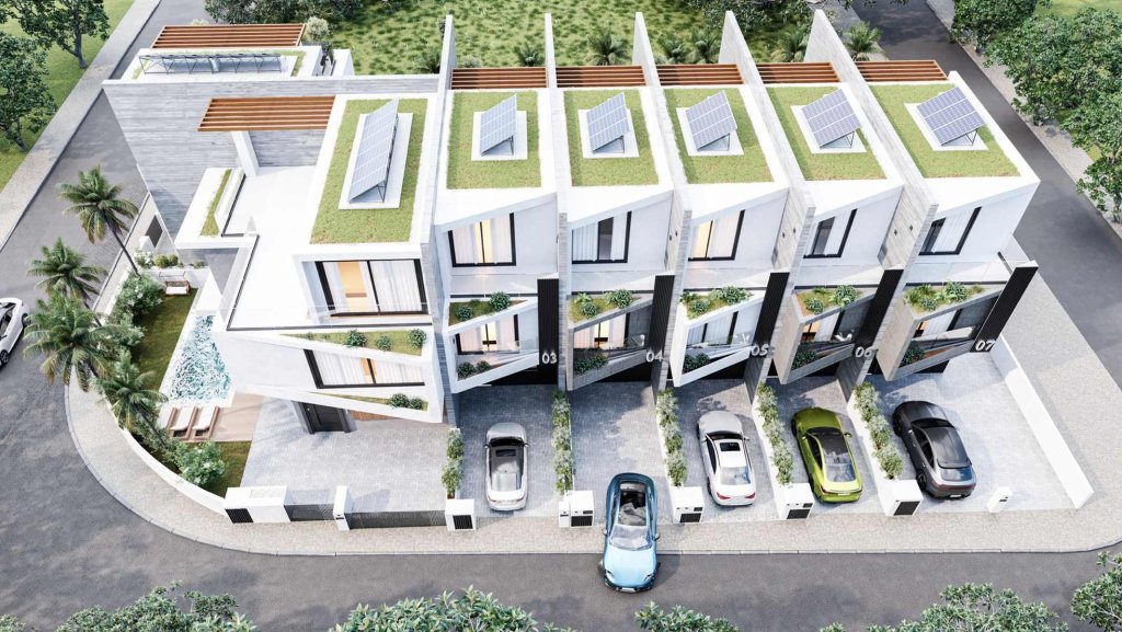 This new residential project is ideally situated in the prestigious Aradippou area of Larnaca, offering excellent access to all amenities, the city center, and the international airport. Set within a gated community, the development comprises 3- and 4-bedroom townhouses thoughtfully arranged to provide a refined sense of privacy, comfort, and contemporary elegance. Each home features a smart system, a private swimming pool, and a unique layout that places one bedroom on the uppermost level with direct access to a roof garden - an inviting retreat for enjoying the Mediterranean climate and beautiful views. The architectural design highlights clean vertical lines and expansive openings that fill the interiors with natural light, creating bright and welcoming living spaces. The ground floor flows seamlessly onto the outdoor cosy terrace, while the upper levels provide well-designed bedrooms with en-suite bathrooms that enhance everyday living. Combining modern aesthetics, functional comfort, and urban convenience, these townhouses are an exceptional choice for families or individuals seeking a peaceful lifestyle with effortless access to everything Larnaca has to offer.
