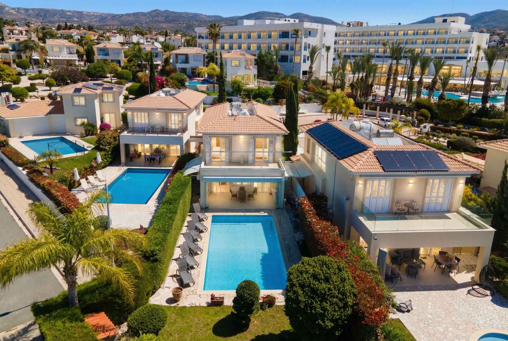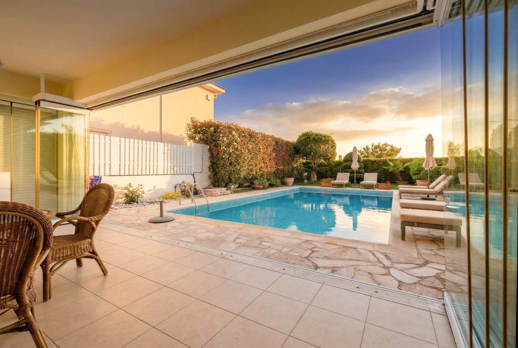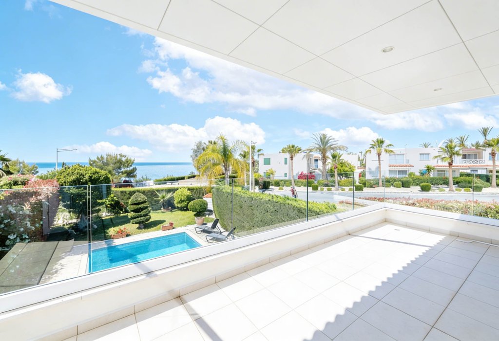 Located in the prestigious Coral Bay area, known for its exceptional microclimate, this elegant villa offers refined coastal living just 100 meters from the sea. Set within a secure, beautifully landscaped complex, the property enjoys privacy and tranquility while being within walking distance to restaurants, bars, shops, and family attractions. The standout feature of the villa — a true rarity in Cyprus — is the double-height living space (second light). This architectural element fills the home with natural light, creating a striking sense of volume, openness, and effortless elegance. Bright, spacious interiors flow seamlessly onto a large balcony with breathtaking sea views, perfect for both relaxation and entertaining. The landscaped garden features exotic plants, citrus trees, and a remarkable 100-year-old olive tree. The villa offers three bedrooms (two with sea views), three bathrooms, and a fully equipped modern kitchen. High-end specifications include automatic shutters, full air-conditioning, Rehau windows, roof insulation, and a security system. Sold fully furnished and tastefully styled, this property is move-in ready and represents an excellent investment opportunity in one of Cyprus’s most sought-after coastal locations.
