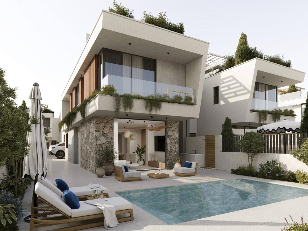 Introducing an exclusive new residential development ideally located just moments from the iconic Nissi Beach, in the heart of Ayia Napa. This distinctive project features a limited collection of only 14 luxury villas with four and five bedrooms, thoughtfully designed to reflect refined aesthetics, contemporary architecture, and an elevated Mediterranean lifestyle. Each villa offers a private swimming pool, a spacious roof garden, beautifully landscaped private gardens, and generous open-plan interiors that create a seamless flow between indoor and outdoor living. Natural materials and elegant stone accents enhance the architectural identity of the residences, while Japandi-inspired interiors introduce a sense of harmony, sophistication, and understated luxury. Expansive openings invite abundant natural light and refreshing sea breezes, allowing residents to fully enjoy Cyprus’ year-round sunshine. Ideally situated within walking distance of the sea, only minutes from the vibrant center of Ayia Napa and just five minutes from Ayia Napa Marina, the development perfectly balances privacy with prime accessibility in one of the island’s most desirable coastal locations. These exceptional villas present a rare opportunity to own a residence in a globally recognized European destination, offering strong growth potential and long-term investment value.