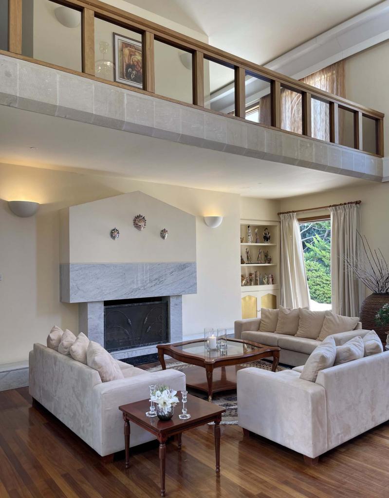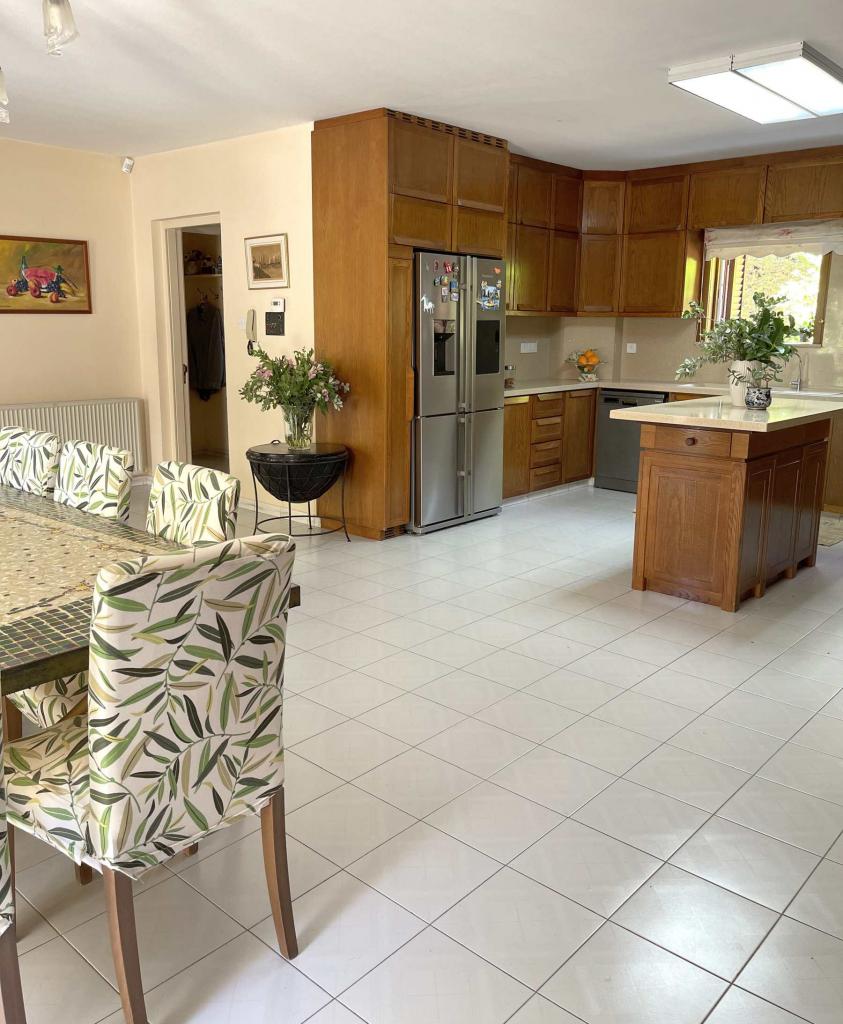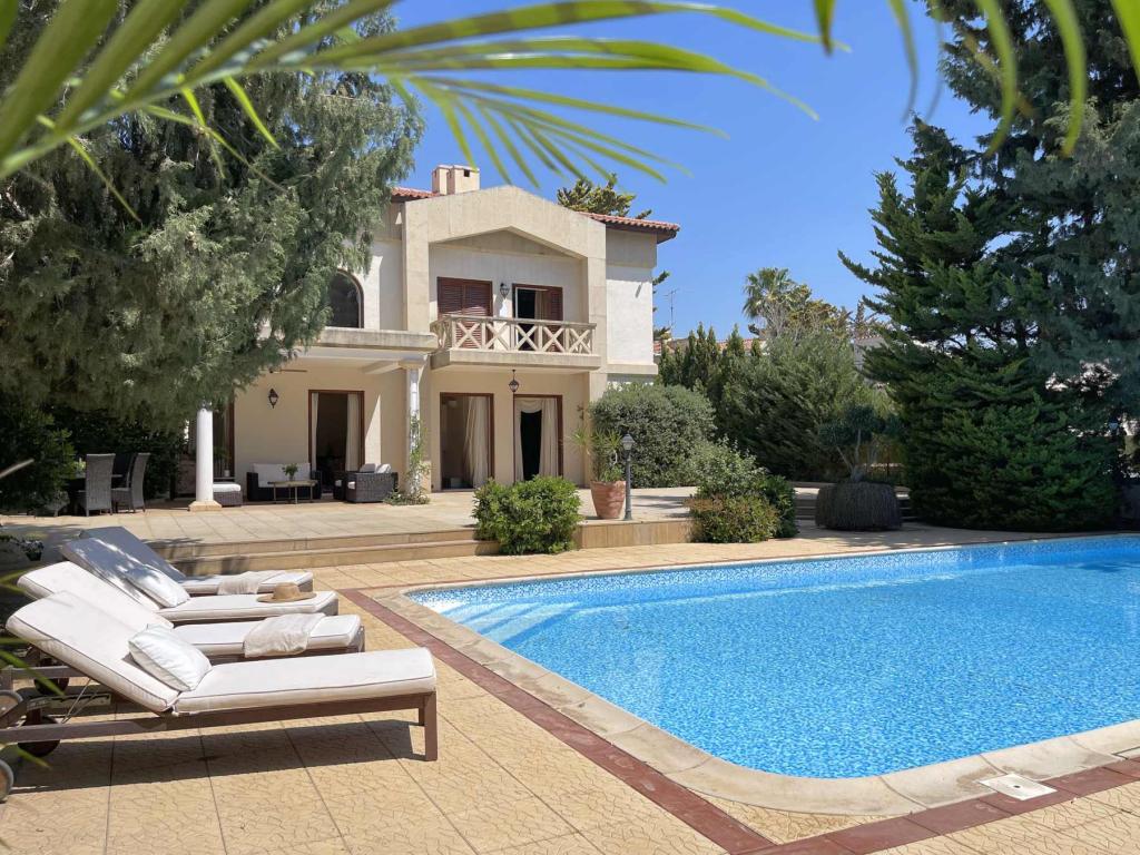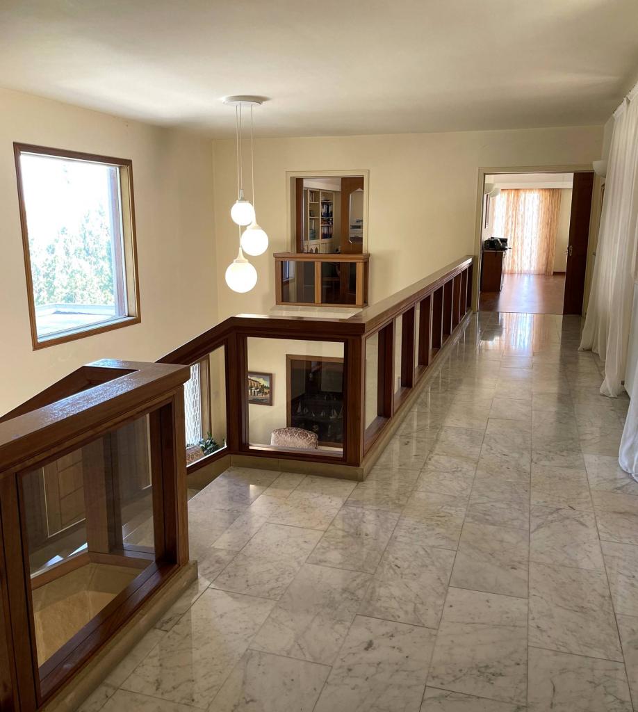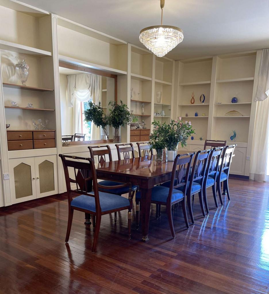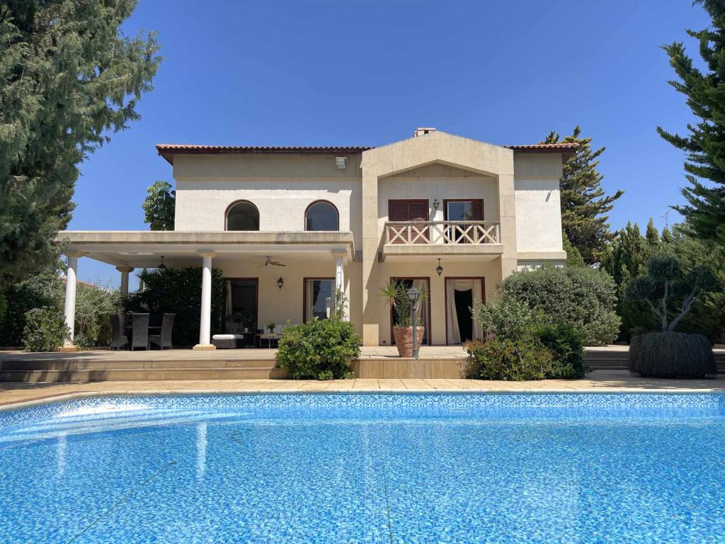 This spectacular 5+ bedroom residence sits in a quiet residential area of Ekali, Limassol, with greenery and great aesthetics all around. The Heritage private school, supermarket, wide variety of shops are in vicinity, making this a perfect option for a permanent residence in Cyprus. The property is a two storey house with a spacious basement and impressive ceiling heights. It was meticulously designed in a classic manner by one of the leading architects to convey amazing family lifestyle. The 2367 sq.m. plot offers beautifully landscaped mature gardens with over 600m2 of lawn, a large swimming pool and stone-paved patios. The entry level has a large entrance area with bar, large double living room, formal dining room, guest toilet, wardrobe, playroom, kitchen with dining area, TV room, toilet, laundry room, wine cellar and a storage room. The upper floor has an office/multi-purpose area and 4 bedrooms - master bedroom with walk-in wardrobe and en-suite bathroom, 2 bedrooms with a shared bathroom and toilet and extra wardrobe, 1 bedroom with en-suite bathroom and a toilet. The maid’s room, storage room, mechanical room are all in the basement area.