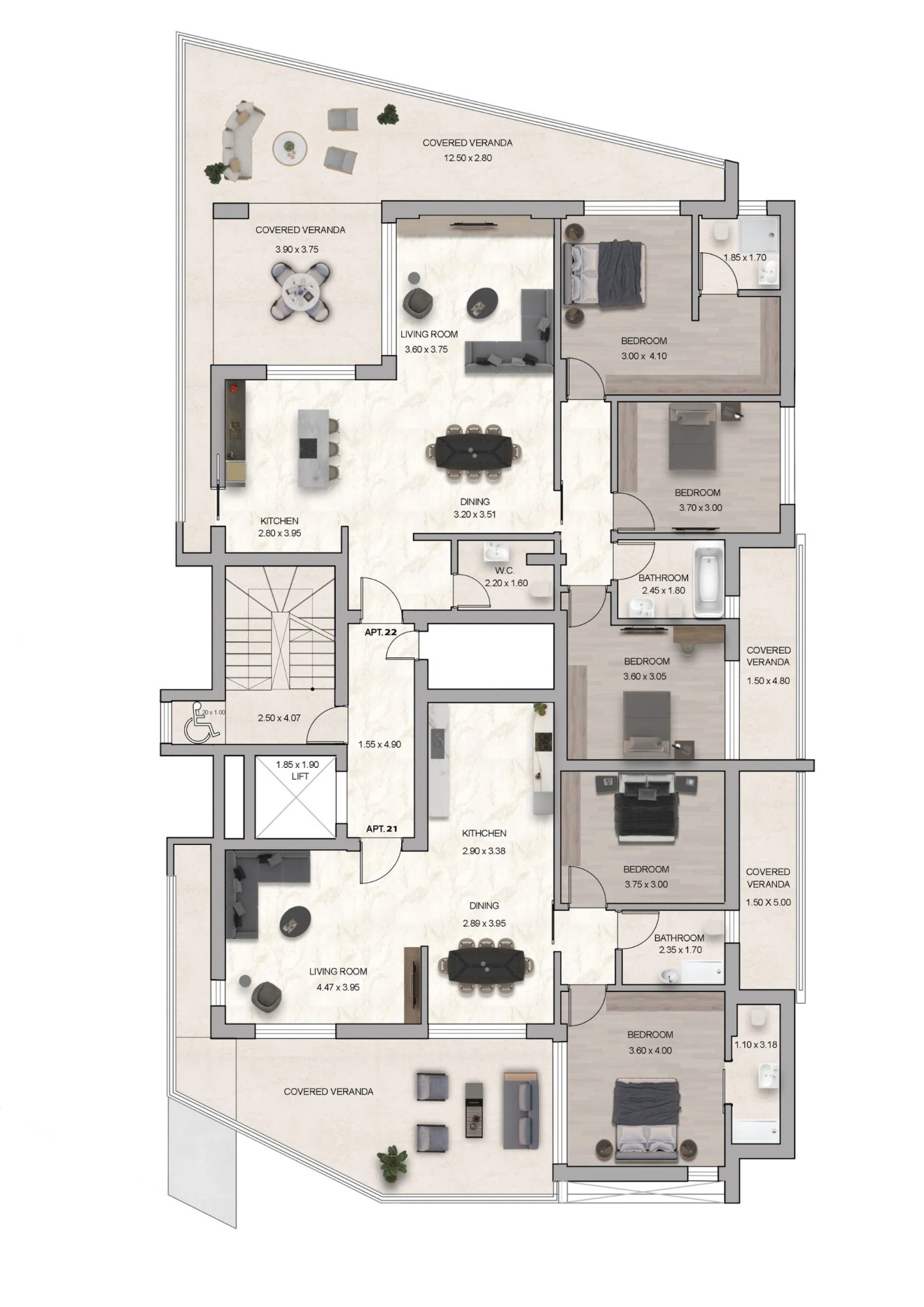 Расположенный в одном из самых престижных районов Лимассола, этот элитный жилой комплекс предлагает изысканную атмосферу и комфорт в прекрасной локации. В шаговой доступности от всей необходимой инфраструктуры и всего в нескольких минутах езды от чистейших пляжей, он идеально сочетает удобство и спокойствие. Архитектурное оформление здания выполнено с учетом современных тенденций. Комплекс был спроектирован с особым вниманием к деталям и включает ограниченное количество элитных апартаментов, отличающихся высоким качеством строительства с использованием материалов премиум-класса. Интерьеры оформлены элегантной итальянской кухонной мебелью, высококачественной керамической плиткой и ламинированным паркетом в спальнях. Большие окна наполняют помещения естественным светом, а детально продуманные планировки обеспечивают комфорт: просторные гостиные, современные кухни и обширные террасы идеально подходят как для отдыха, так и для приема гостей. Жильцам предлагаются современные энергоэффективные решения, включая окна с двойным остеклением, системы солнечного нагрева воды и система кондиционирования VRV. Дополнительные спецификации включают подогрев полов, системы безопасности, отдельные кладовые и крытые парковочные места. Пентхаусы имеют эксклюзивный доступ к террасам на крыше с частными бассейнами и потрясающими панорамными видами. Окруженный ухоженным ландшафтным садом, этот комплекс идеально сочетает роскошь, уединенность и удобство, что делает его отличным выбором для будущих владельцев или арендаторов.